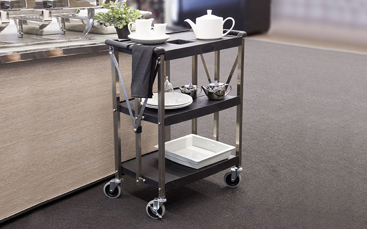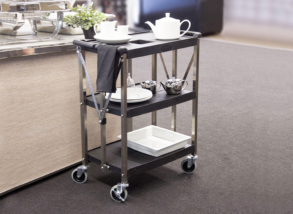堅(jiān)厚的不銹鋼材料,車表面帶有磨砂處理,美觀耐用卡扣設(shè)計(jì),可快速、簡單的折疊或展開餐車; 折疊存放可減少50%的面積; 符合人體工學(xué)的把手設(shè)計(jì),操作舒適; 4”萬向靜音輪,其中兩個(gè)帶剎;安全,安靜可承重150KG; 廣泛使用于各類餐廳和酒店.